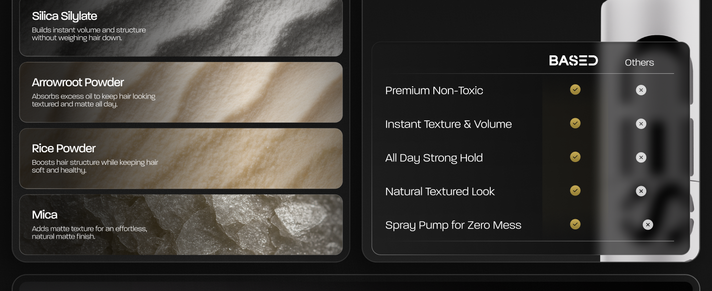 Unlike traditional styling products that can leave your hair feeling overly stiff or greasy, BASED Texture Powder offers a lightweight, matte finish that adds instant volume and texture.